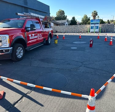 Our uniformed personnel will arrive at your site in a company-owned and insured vehicle with high-visibility Graphics. It will be clear that our proprietary 2-20# ABC Fire Extinguishers/14 Traffic Cones combination racks mounted on our trucks create a safety forcing function so that these crucial Safety devices become First Down-Last Up items. We have fabricated and mounted on every test truck a hand wash/eye rinse fluid combination station. Water/ice/snacks/hydration aids are maintained in mounted Milwaukee # 40QT XL coolers.